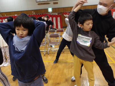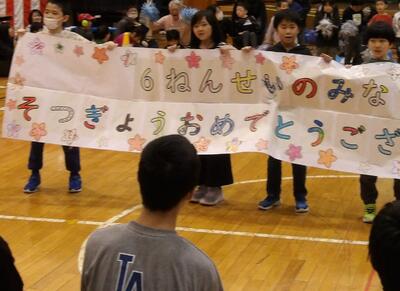 2月25日(水)の3・4校時に、小学部全学年で今年最後の学部集会「6年生を送る会」が体育館で、5年生の司会で行われました。歓迎会では恥じらいがちだった1年生も、2年生と一緒に元気な声で『レッツゴー』を歌い、横断幕を持ちながらお祝いの言葉を添えました。3・4年生は『ぼくらはちいさなかいぞくだ』と『ペンギンダンス』、5年生は、『6年生へのYMCA』をエネルギッシュに歌って踊りました。最後に6年生の大好きな『おじゃ魔女カーニバル』をみんなで踊って、卒業する6年生を盛大にお祝いしました。