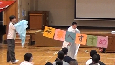 12月8日(月)に、中学部と高等部で芸術鑑賞会を行いました。今年は、釧路市で活動する劇団、「劇団 東風」さんに、『ヒーローショー カモメンジャー』を鑑賞させていただきました。開演前には、体育館に設置された舞台や照明などを見て、どきどきした表情を浮かべていた生徒たちでしたが、公演が始まると、目の前で繰り広げられる悪の組織と釧路の平和を守る「カモメンジャー」の激しい戦いに、生徒たちから「がんばれー」「負けるなー」と応援の声が挙がりました。生徒からの応援を受けて、無事に「カモメンジャー」の勝利!閉演後には、生徒会代表生徒からお礼の言葉を伝え、たくさんの拍手で芸術鑑賞会を終えることができました。